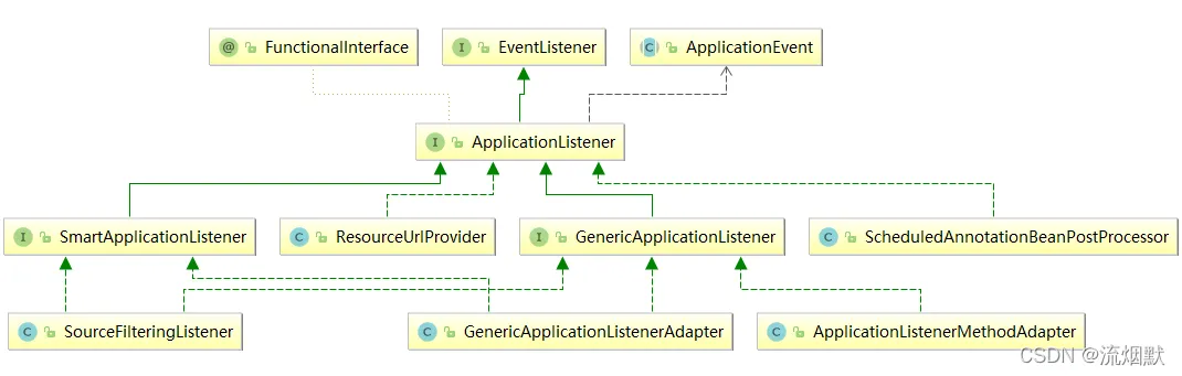 这是因为EventListenerMethodProcessor 处理器会解析@EventListener 注解,将其所在类封装为一个ApplicationListener(比如这里的ApplicationListenerMethodAdapter),然后放入容器中。EventListenerMethodProcessor实现了SmartInitializingSingleton、ApplicationContextAware以及BeanFactoryPostProcessorj接口,有兴趣的可以看下其源码。常见的ApplicationListener树结构示意图