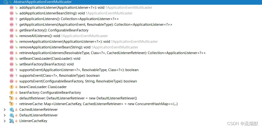 该抽象类实现了ApplicationEventMulticaster接口,提供了基础的监听器注册/移除以及查找能力。