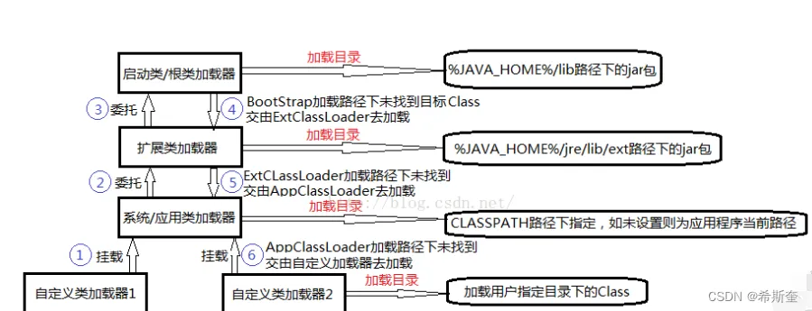 3. 负责加载用户路径(classpath)上的类库。 JVM 通过双亲委派模型进行类的加载,当然我们也可以通过继承 java.lang.ClassLoader 实现自定义的类加载器。