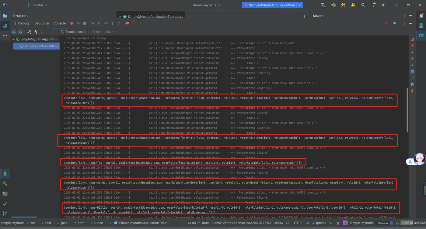 @Test @SneakyThrows void sqlSessionWay() { Assertions.assertAll(() -> { try (SqlSession session = sqlSessionFactory.openSession(); Cursor<UserInfo> userCursor = session.getMapper(UserMapper.class).selectPageCursor(new RowBounds(0, 5))) { StreamSupport.stream(userCursor.spliterator(), true).forEach(System.out::println); } }); }
