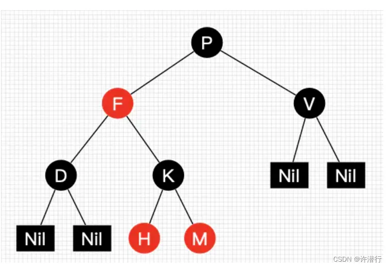 - 每个叶子节点(NIL节点,不包含键值的节点)都是黑色的。