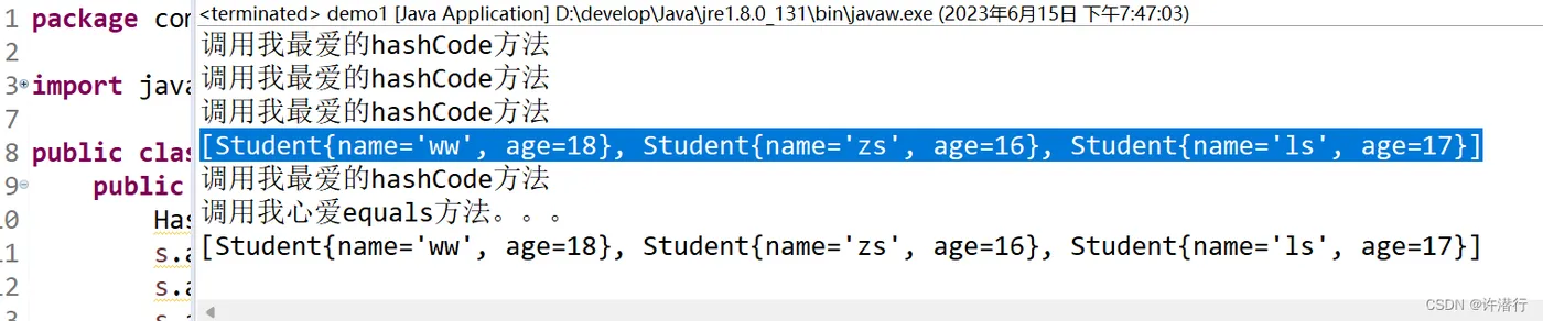 public static void main(String[] args) { HashSet s = new HashSet(); s.add(new Student("zs", 16)); s.add(new Student("ls", 17)); s.add(new Student("ww", 18)); System.out.println(s);//[Student{name='zs', age=16}, Student{name='ww', age=18}, Student{name='ls', age=17}] s.add(new Student("ww", 18)); System.out.println(s);//[Student{name='zs', age=16}, Student{name='ww', age=18}, Student{name='ww', age=18}, Student{name='ls', age=17}] }
