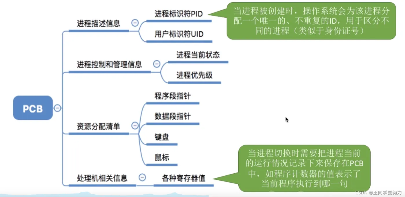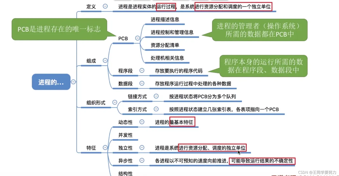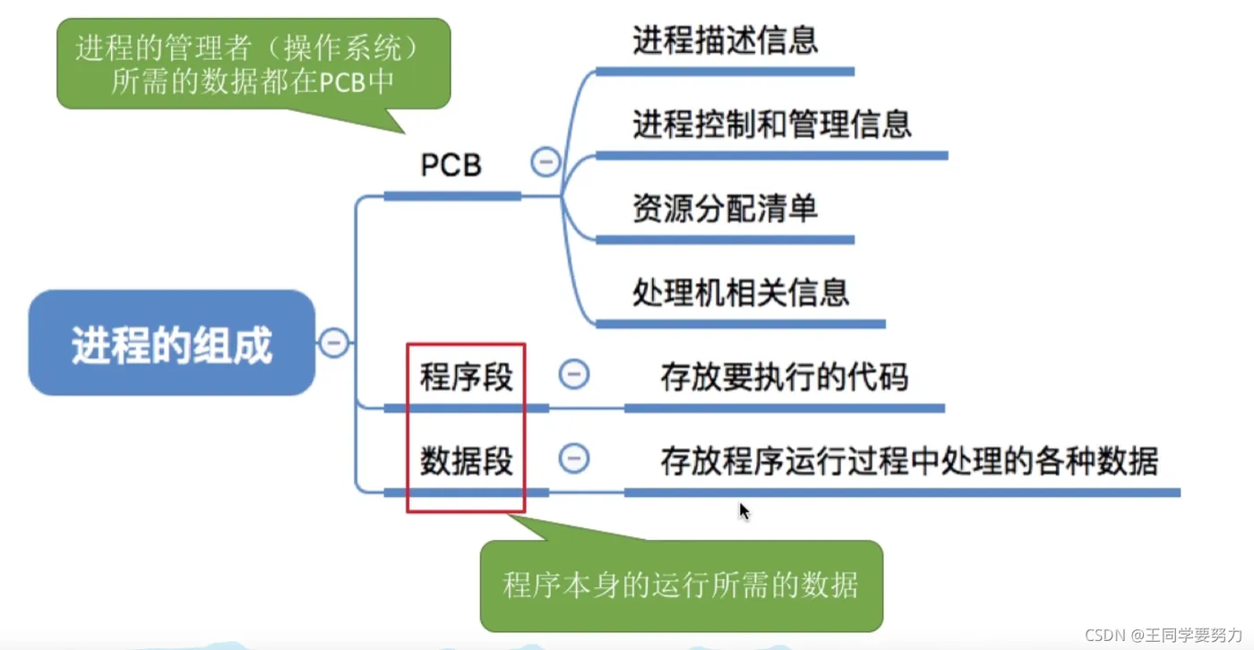 程序段、数据段、PCB三部分组成了进程实体(进程映像)。一般情况下,我们把进程实体称为进程,例如:所谓创建进程,实际上就是创建进程实体中的PCB,而撤销进程,实际上就是撤销进程实体中的PCB。注意:PCB是进程存在的唯一标志