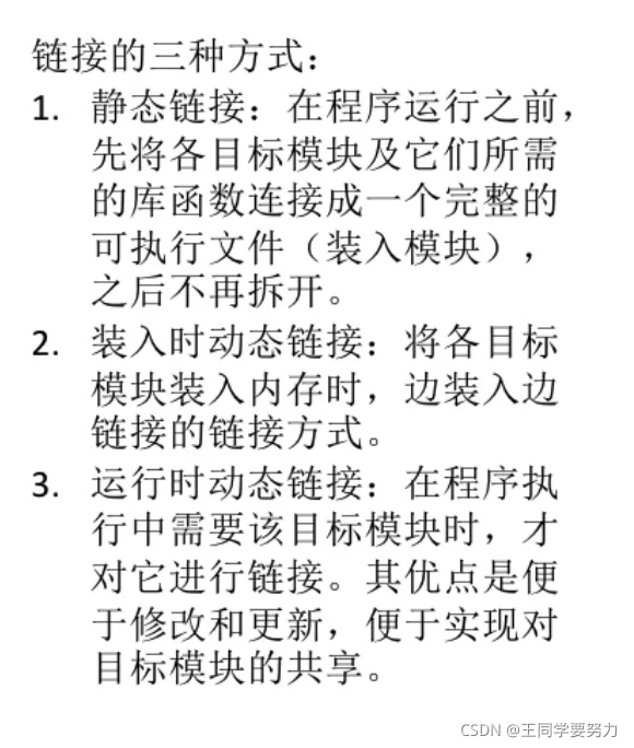 链接:由链接程序将编译后形成的一组目标模块,以及所需函数链接在一起,形成一个完整的装入模块