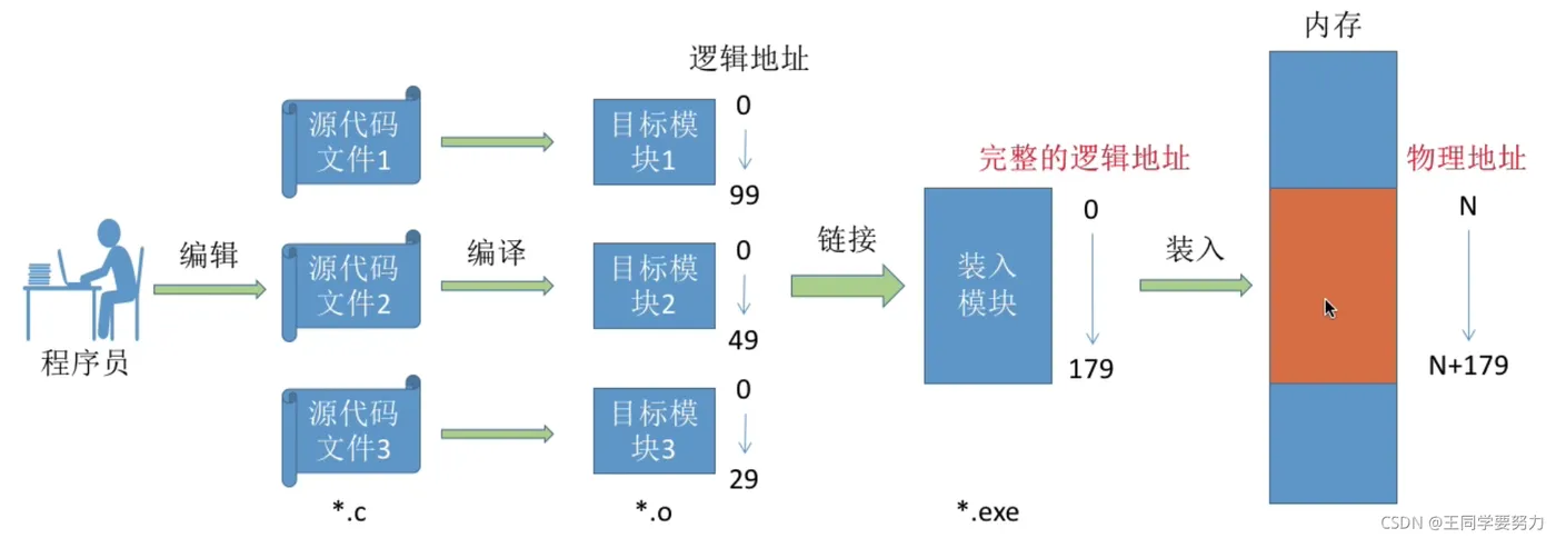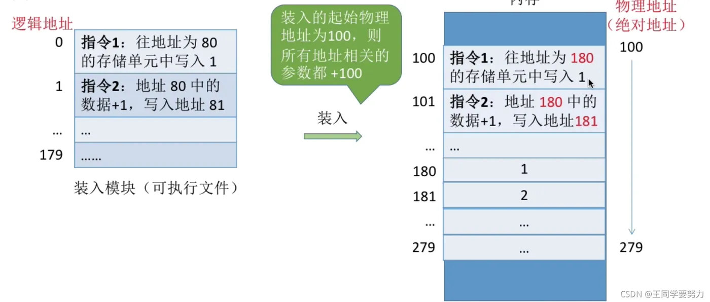 静态重定位:又叫可重定位装入。编译、链接后的装入模块都是从0开始的,指令中使用的地址,数据存放的地址都是相对于起始地址而言的逻辑地址,可根据内存的当前情况,将装入模块装入到合适的位置,装入时对地址进行重定位,讲逻辑地址变换为物理地址(地址变换是在装入时一次完成的)