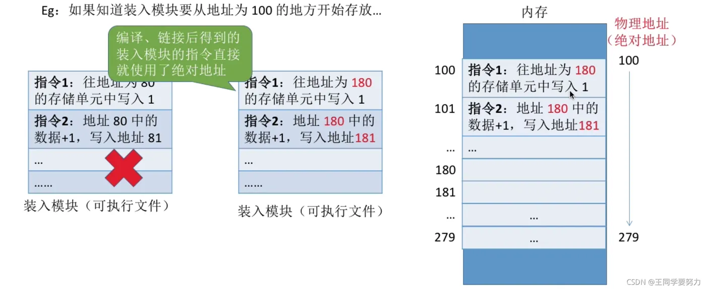 绝对装入:在编译时,如果知道程序将放到内存中的哪个位置,编译程序将产生绝对地址的目标代码。装入程序按照装入模块中的地址,将程序和数据装入内存。