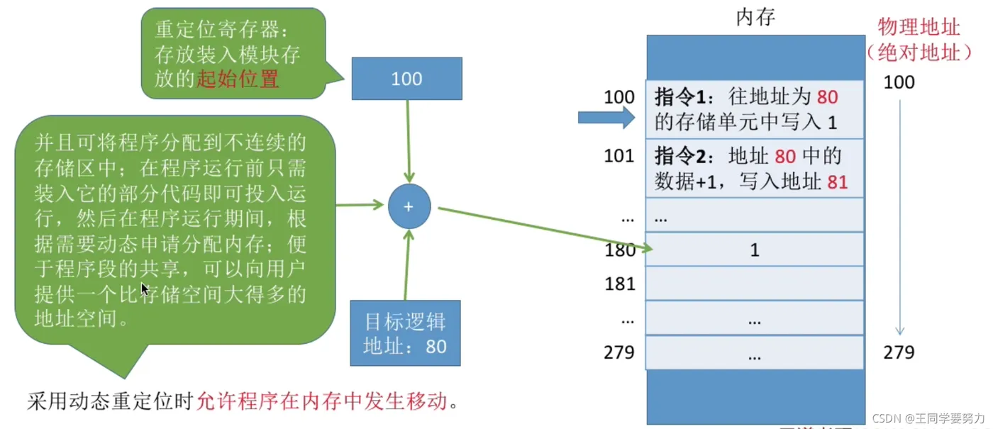 动态重定位:又称动态运行时装入,编译、链接后的装入模块的地址都是从0开始的,装入程序把装入模块装入内存后,并不会立即把逻辑地址转换为物理地址,而是把地址转换推迟到程序真正要执行时才进行,因此装入内存后所有的地址依然是逻辑地址,这种方式需要一个重定位寄存器的支持。