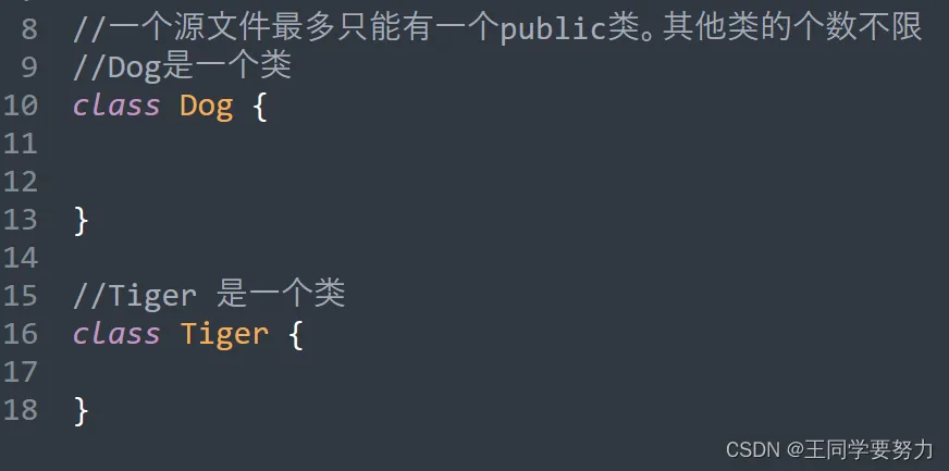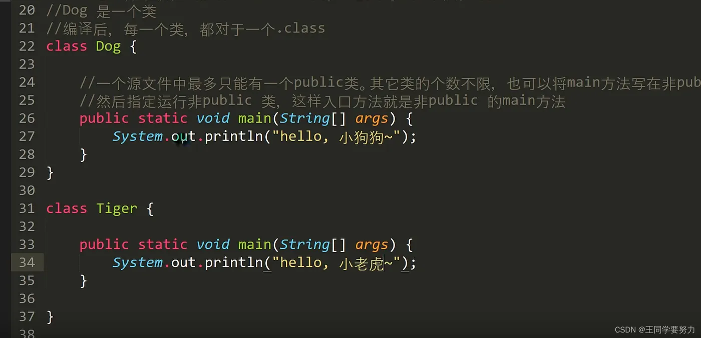 - 一个源文件中最多只能有一个public类,其他类的个数不限,也可以将main方法写在非public类中,然后指定运行public类,这样的入口方法就是非public的main方法。