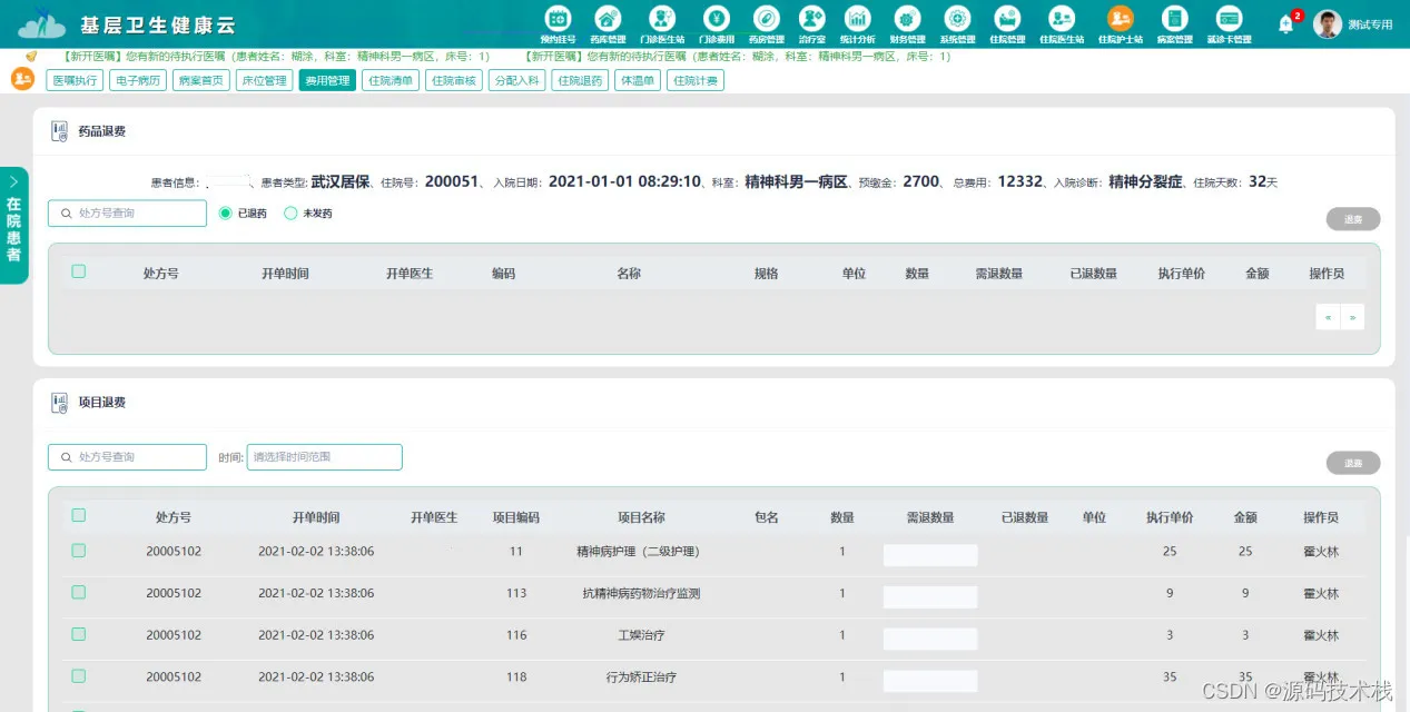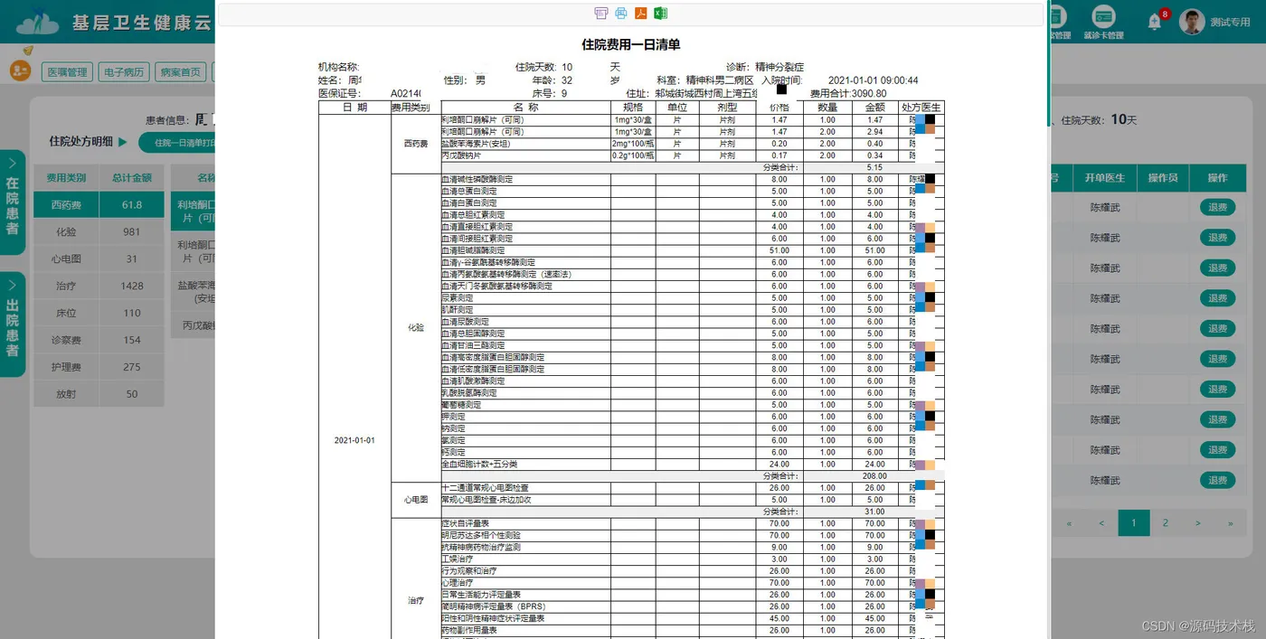 住院清单可以查看住院患者住院处方明细及费用,可以打印住院清单,还可以执行退费操作。