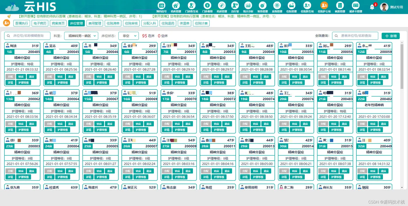 住院护士站是提供给住院部护士使用的界面,其包含了十个子界面,分别为:医嘱执行、电子病历、床位管理、费用管理、住院清单、住院审核、分配入科、住院退药、体温单、住院计费。