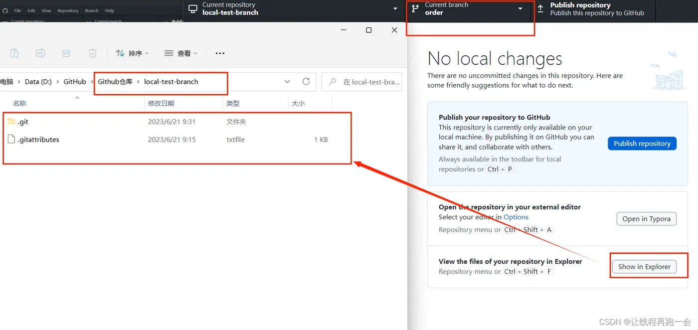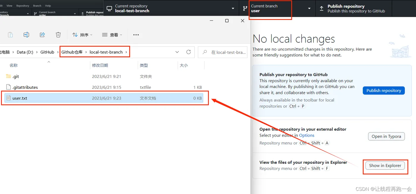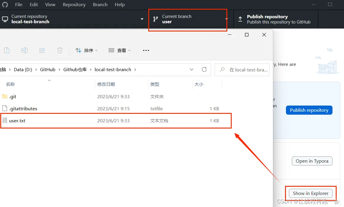 我们选择user分支,然后“show in explorer”打开 user 分支目录,创建user.txt