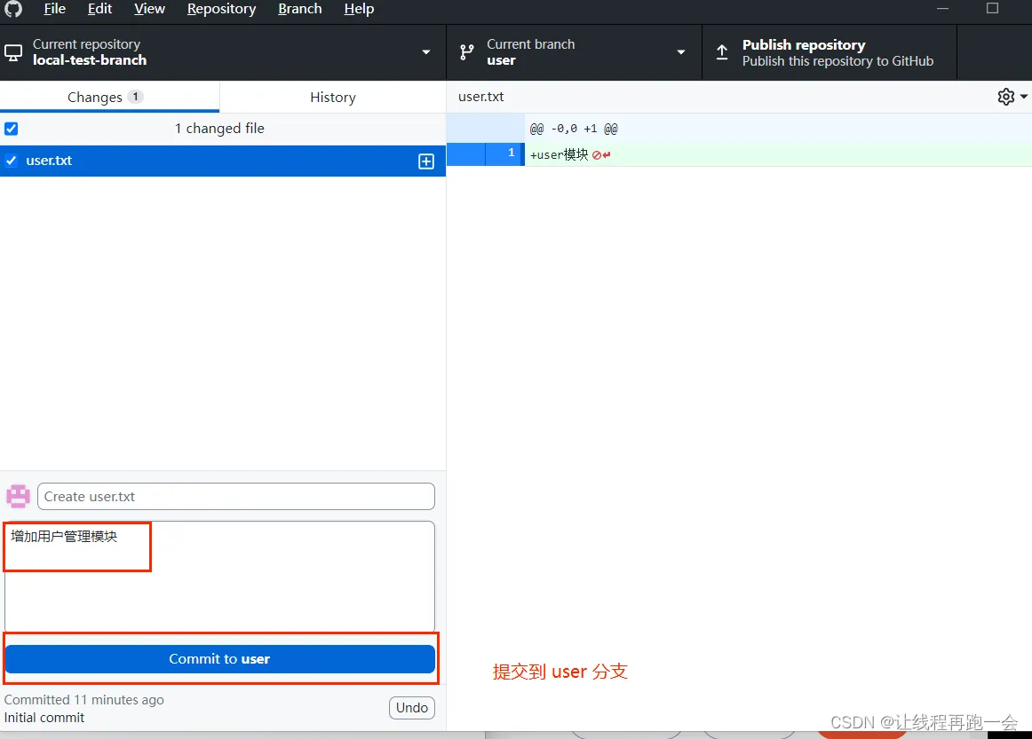 合并完成,主分支出现了 user 分支下的文件 user.txt