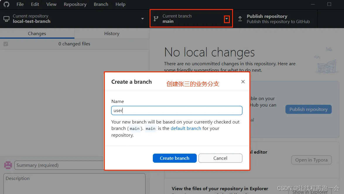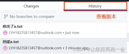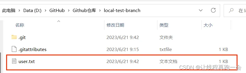 我们发现,分支的目录路径都是我们的主分支目录,但是原本张三创建的 user.txt 却从分支目录消失了,这是因为我们切换了分支,切换分支后,给我们展示的就是不同的目录,并不是文件被删除了,我们切换回 user 分支,再次打开目录就会发现user.txt 依然存在。