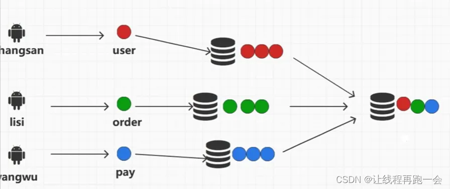 张三和李四是我们的开发人员,张三副本用户模块,李四负责订单模块。王五是项目经理(负责仓库的管理和维护),王五创建两个副本(分支)给张三李四,最后他俩任务完成后进行一个分支的合并,将结果 合并到我们的仓库中。