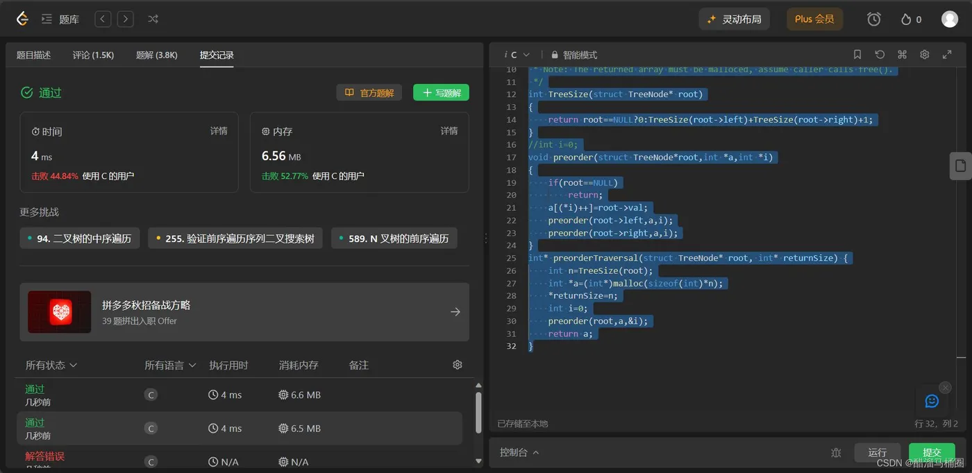 这道题的难点在于,前序遍历一遍之后需要将数值存在数组里,returnsize就是数组的大小