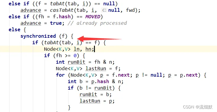 在transfer方法中我们可以到处看到CAS思想,比如advance = casTabAt(tab, i, null, fwd);。此外,在对槽位进行调整的时候对槽位结点进行了重锁,如下所示: