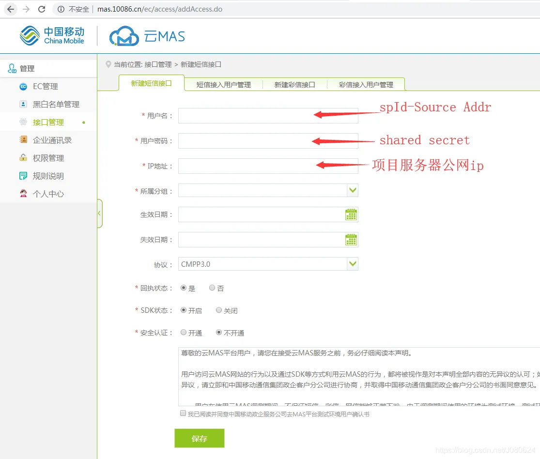 这里用的是移动的云mas,移动云mas首先要申请账号,移动政企申请后会把账号、密码和EC name(企业名称)发给你,然后你需要登录http://mas.10086.cn/login 页面后台,进行一系列操作。