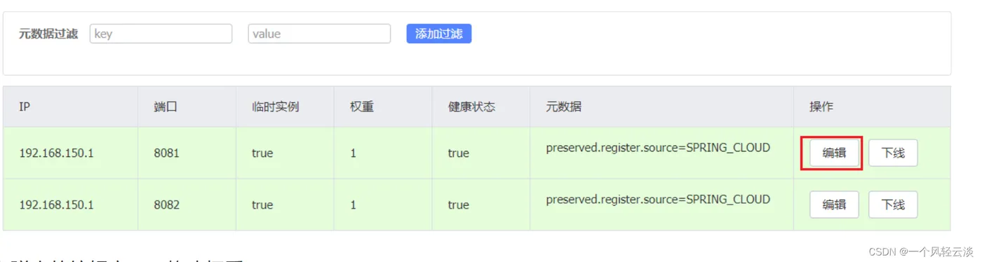 服务器设备性能有差异,部分实例所在机器性能较好,另一些较差,我们希望性能好的机器承担更多的用户请求。但默认情况下NacosRule是同集群内随机挑选,不会考虑机器的性能问题。因此,Nacos提供了权重配置来控制访问频率,权重越大则访问频率越高。在nacos控制台,找到user-service的实例列表,点击编辑,即可修改权重: