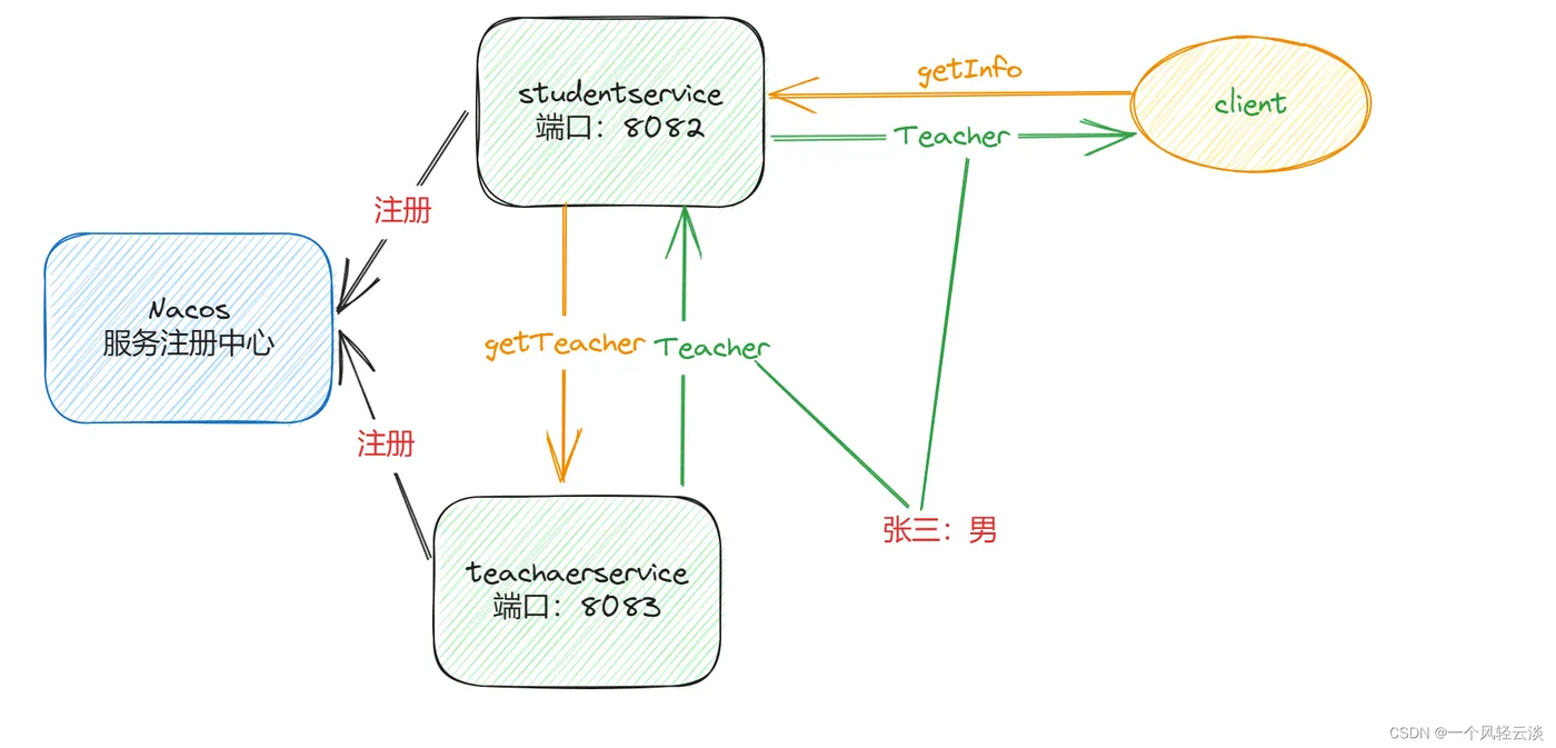 俩个为俩个不同的端口的service端,客户端向8002端口的studentservice发送一个请求(/getInfo)以后,8002端口的studentservice需要往teacherservice发送一个请求(/getTeacher)返回数据。