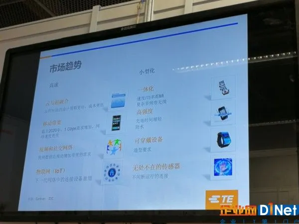 Jason指出,在数据中心连接领域,同样有各种新的行业趋势出现,TE将之归纳为高速与小型化:“随着企业将业务迁移到云端以及基于云的新业务不断涌现,要求云供应商的设计周期更短、成本更低;在移动宽带领域,到2020年5G就将上马,网络速率将达到10Gbps以上;视频数据流与社交网络推动带宽显著增加;物联网的进程不断加快,下一代网络中的连接设备将激增。”