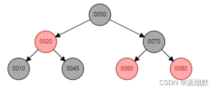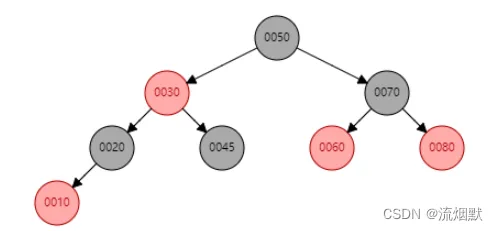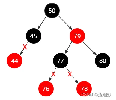 如下所示,我们尝试删除黑色结点45。那么此时左右子树必然不满足“任意路径黑色结点数量相同”