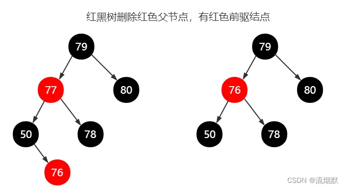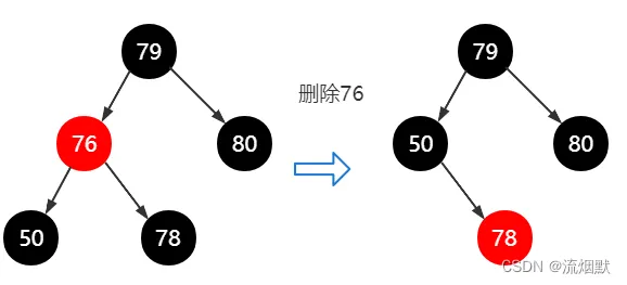 这种情况是最简单的,直接用红色前驱结点(76)替代当前红色结点(77)即可,不会发生结构调整,不会引起颜色改变。