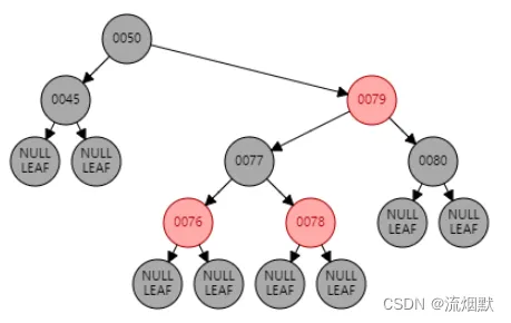 如下所示,删除红色叶子结点如44、76、78时,是不会引起任何变化的,直接删除即可。