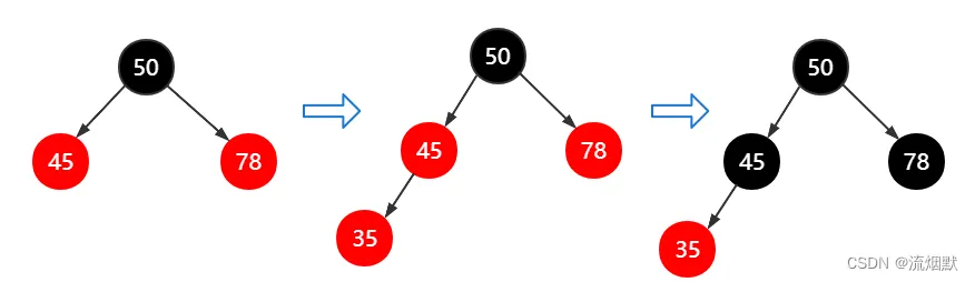 - 插入35,这时35和45都是红色结点,那么需要调整45结点颜色为黑色