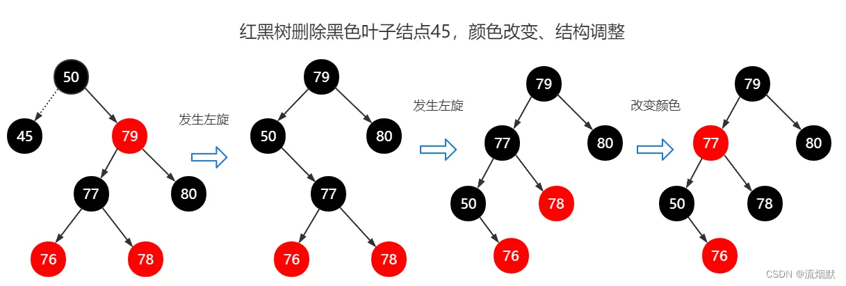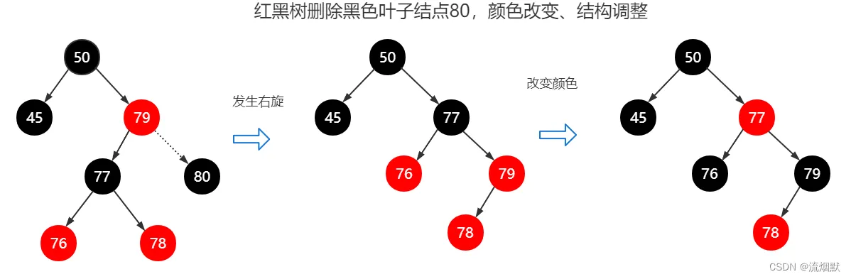 此时不一定会引起结构调整,但是一定会导致颜色改变。比如下面这个实例,前驱结点50替代删除结点(76),此时仍旧满足红黑树的性质,无需发生结构调整。