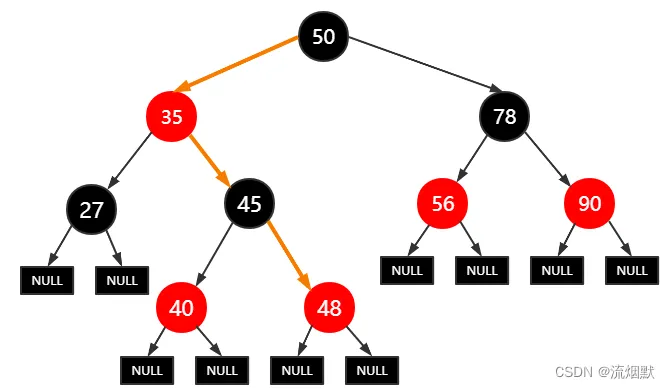 如下所示,查找元素48。那么从根节点开始,路径为:50--35--45--48 。