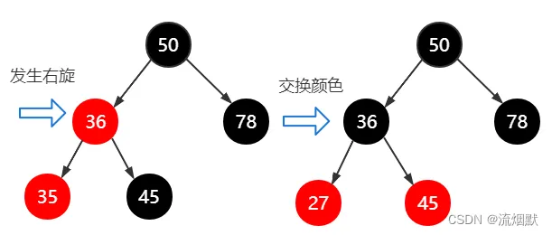 此时可以看到,又发生了两个红色结点连续的情况。原本黑色父祖父结点45成为新的父节点(36)的右子节点。那么交换父节点(36)与右子节点(45)的颜色即可。