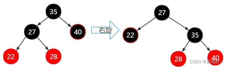 拎起目标结点(35)的左子节点(27),使目标结点(35)向右下沉,成为左子节点(27)的右子节点(35),左子节点上升成为其父节点。原先左子节点(27)的右子节点(28)变成新父节点(27)的右子节点(35)的左子结点(28)。