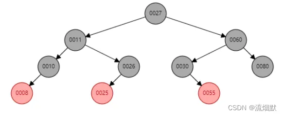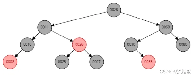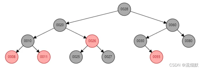 如删除上图中的30,那么55将作为祖父结点(60)的左孩子。由于删除结点(30)与后继结点(55)颜色不一致,所以修改55结点颜色为黑色以保持黑色结点的平衡。
