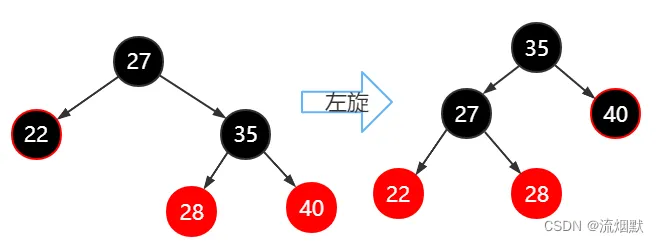 拎起左旋节点(27)的右子节点(35),使左旋节点向左下沉,成为右子节点(35)的左子节点,右子节点(35)上升成为其父节点。修改原先右子节点(35)的左子节点(28)从属关系使其变成新父结点的左子节点的右结点。