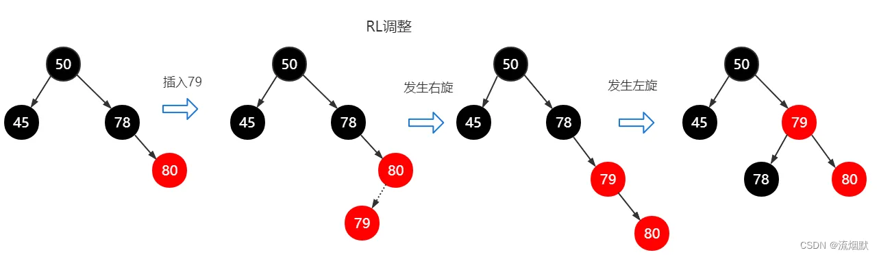 如果删除的不是45而是80呢?那么此时会发生右旋。此时对于50、79、77来讲就是RL调整。