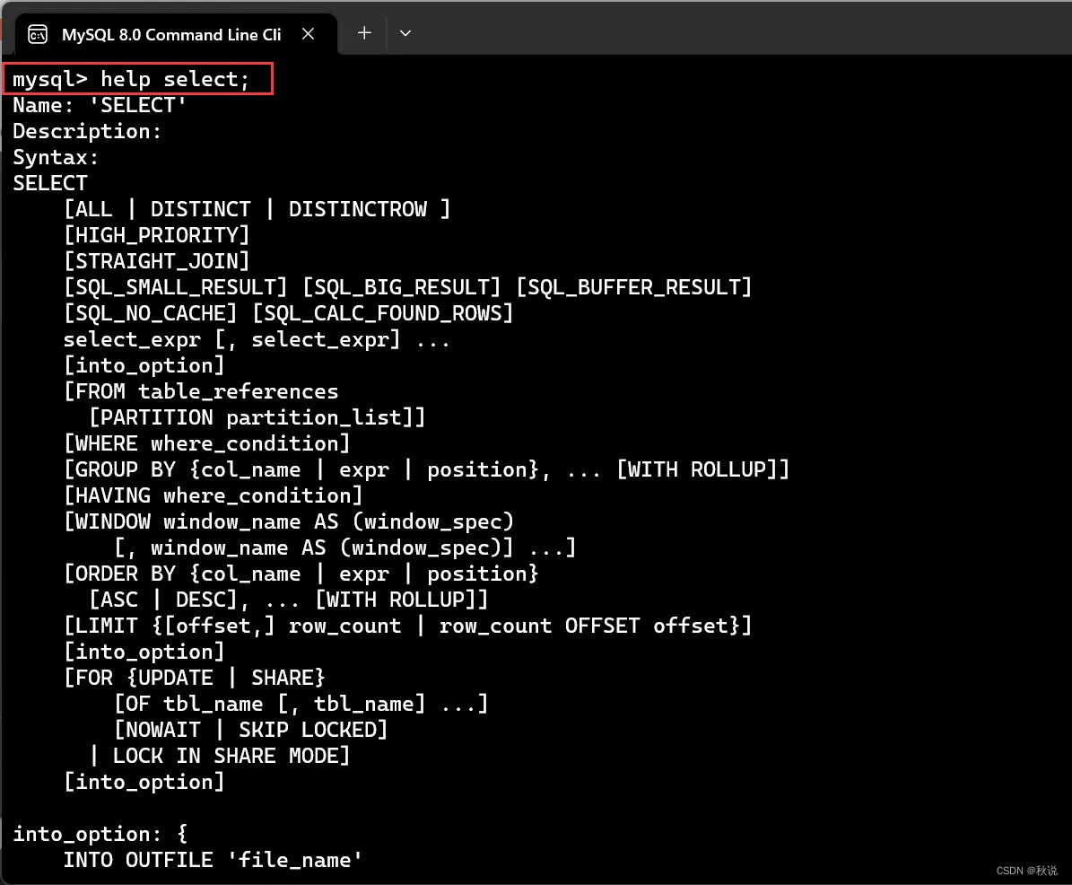 2.使用 help 命令:help 命令是一个内置的命令行工具,可用于查看其他命令的帮助信息。要查看 select 命令的帮助信息,可在命令行上输入 help select。