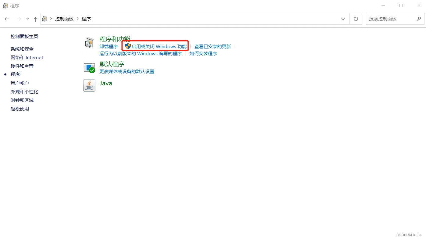 在控制面板打开程序,然后点击启动或关闭windows功能