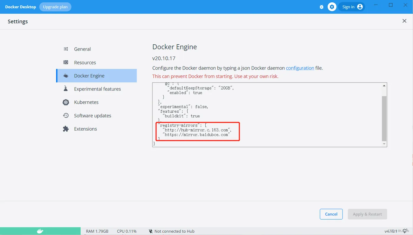 "registry-mirrors": [ "http://hub-mirror.c.163.com", "https://mirror.baidubce.com" ]