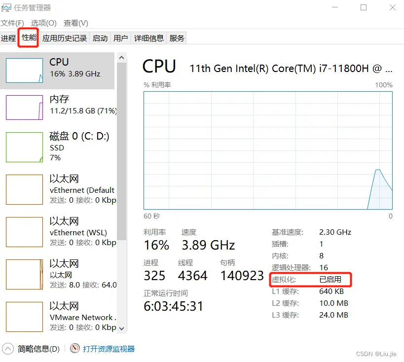 打开任务管理器(CTRL+ALT+DELETE)-> 选择性能 -> CPU ->虚拟化,确认是否已启用