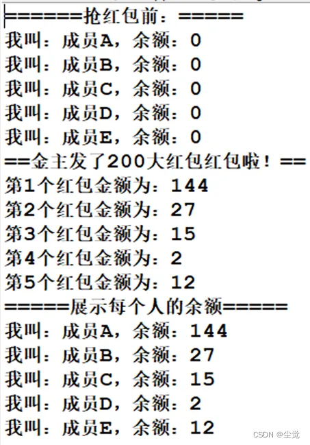 这个类的作用是定义成员的名字和余额 然后等待前面的程序执行完成时候用户调用show方法来输出抢红包之后余额一共有多少钱