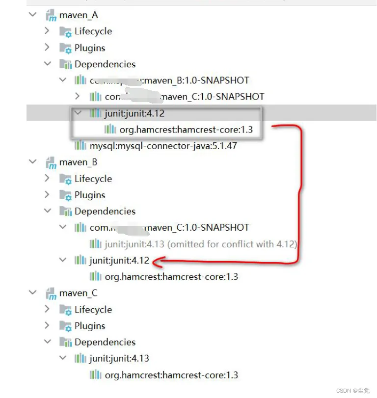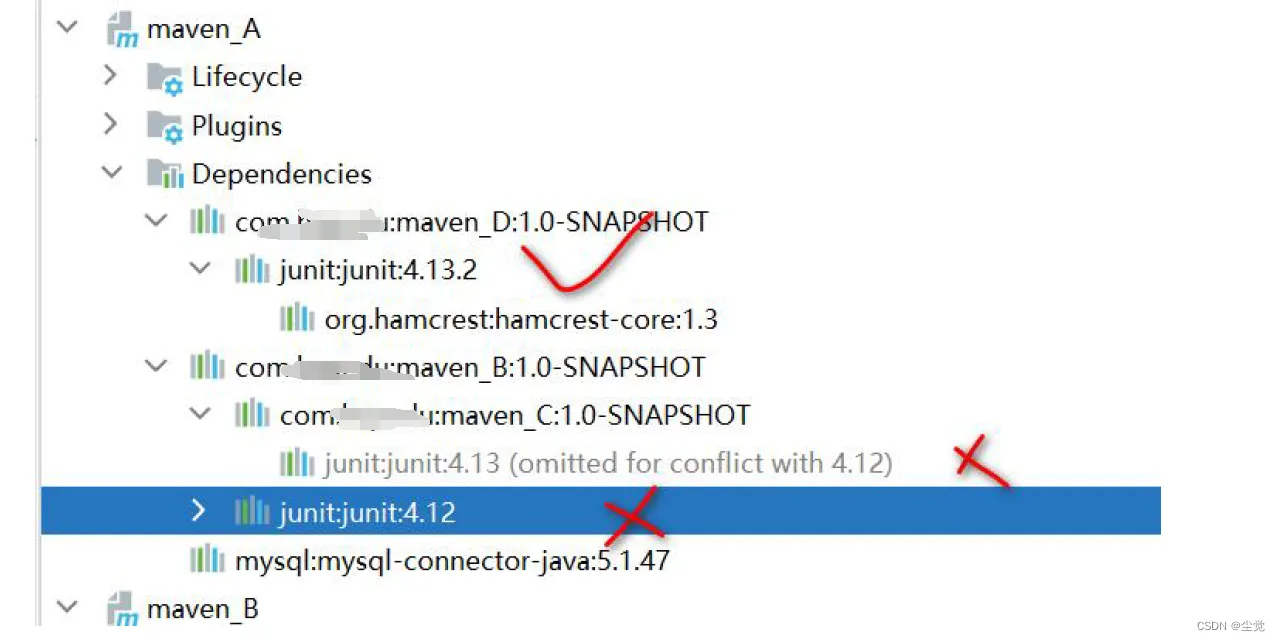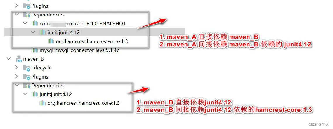 - 根据路径优先原则, 项目A 生效的是junit4.1