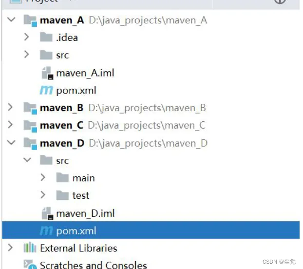 - 创建maven_D(为了方便观察,仍然放在一个项目中), 创建方式和maven_B 类似,就不截图了