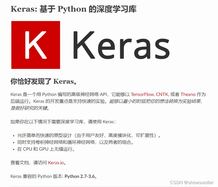 Keras是一个用Python编写的高级神经网络API,它能够以Tensorflow、CNTK或者Theano作为后端运行,是一个模块化,最小化并且非常容易扩展的架构,它的开发者Francois Chollet说:当时开发这个库的目的是快速的实验,能够在最短的时间内把想法转换成结果,而这正是好的研究的关键,下面网址是Keras的中文文档手册,其具体特点如下