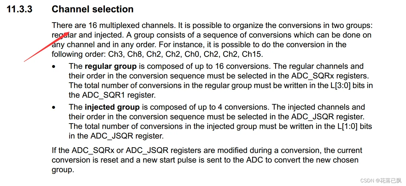 这个 ADC 具有 16 个复用通道,可以将转换分为两个组:常规组和注入组。一个组包含一系列的转换,可以在任何通道上以任意顺序进行。例如,可以按照以下顺序进行转换:Ch3, Ch8, Ch2, Ch2, Ch0, Ch2, Ch2, Ch15。