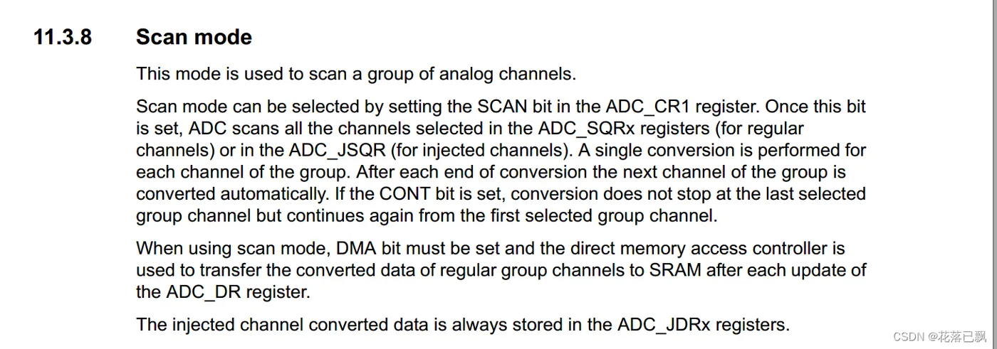 在扫描模式下,ADC可以按照用户指定的通道顺序连续地进行模数转换,而不需要在每次转换中重新配置通道。以下是扫描模式的关键要点: