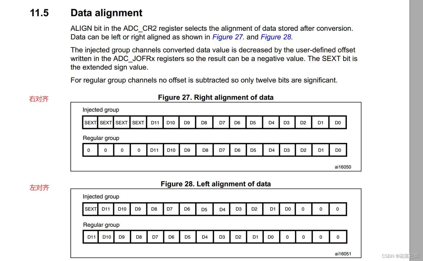 在左对齐模式下,ADC转换结果的最高有效位(MSB)被放置在数据寄存器的最高位(最左侧),而低有效位(LSB)则按照递增的顺序排列在其右侧。也就是说,数据的高位位于数据寄存器的高位,低位填充为零。