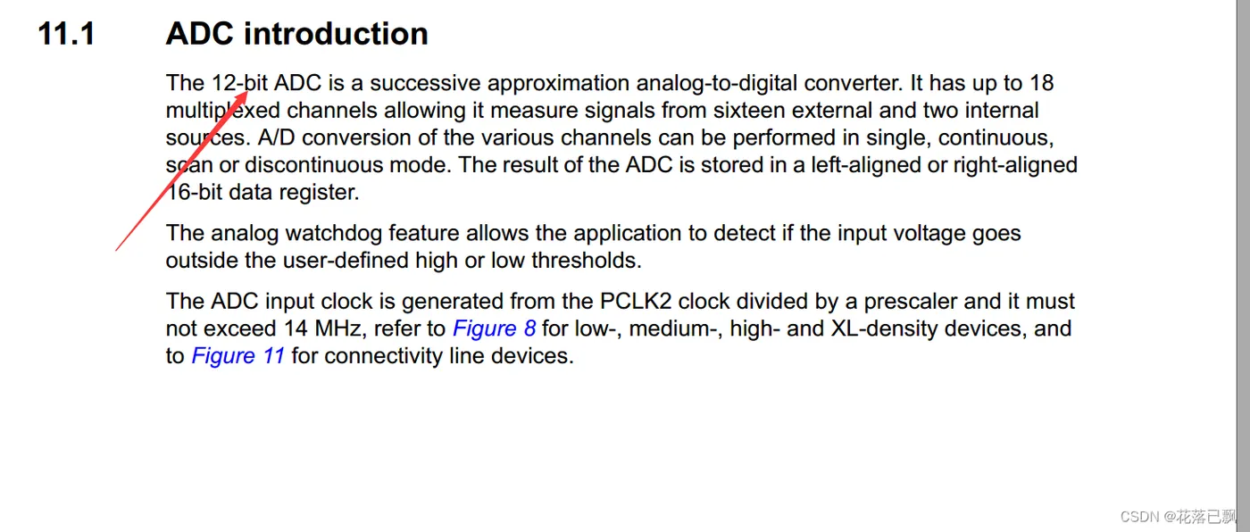 在手册中我们可以看到这款STM32F1的ADC位数是12bit的。