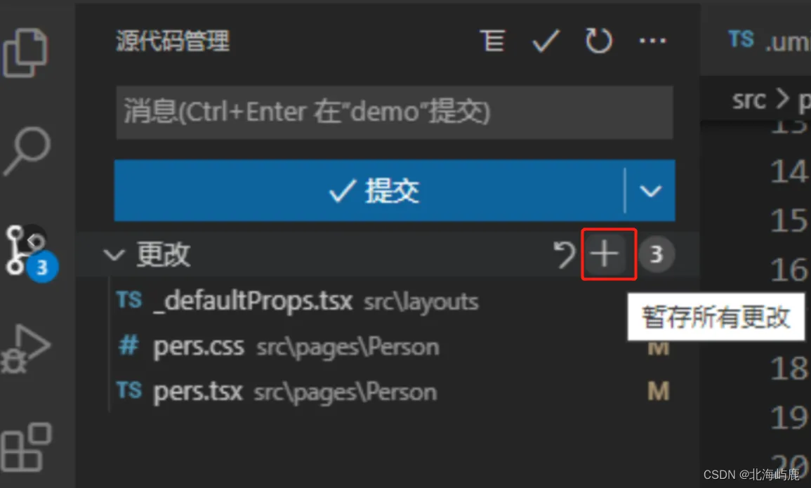 点击更改一栏最右边的+号,就是将所有更改过的文件存入暂存区;