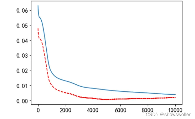 采用Sigmoid激活函数、四层(1,5,5,1)结构、训练轮数为10000,以训练轮数为横坐标、误差值为纵坐标,画出训练误差和测试误差的走向