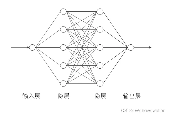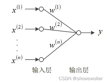 基于全连接层构建的多层神经网络能够用来完成回归和分类人物,在神经网络中一般用下图所示画法来表示神经元模型,神经元由输入层和输出层组成,输入层负责接收信息,并将信息传给输出层,输出层负责求和,产生激励信息并输出